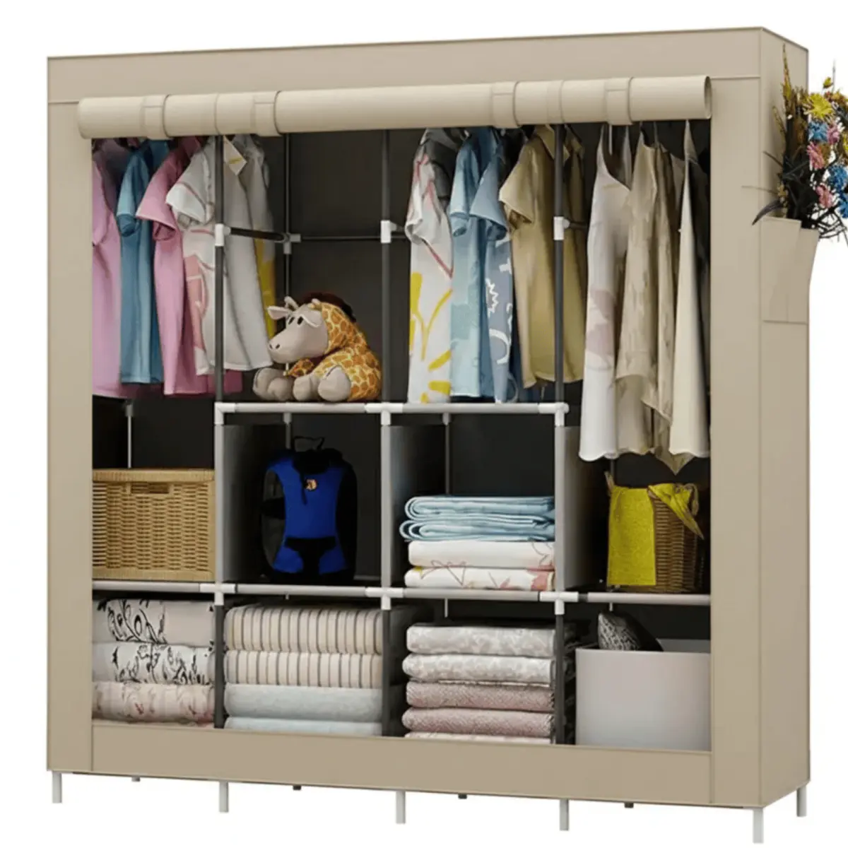 El Armario Portátil Plegable con Estantes y Perchero – Tela Resistente, Gran Capacidad y Diseño Antipolvo es la solución ideal para quienes buscan optimizar el espacio en su hogar. Con unas dimensiones de 1,72 m de altura, 1,68 m de ancho y 45 cm de profundidad, este organizador se adapta perfectamente a cualquier rincón, ofreciendo un amplio espacio para almacenar ropa y accesorios.