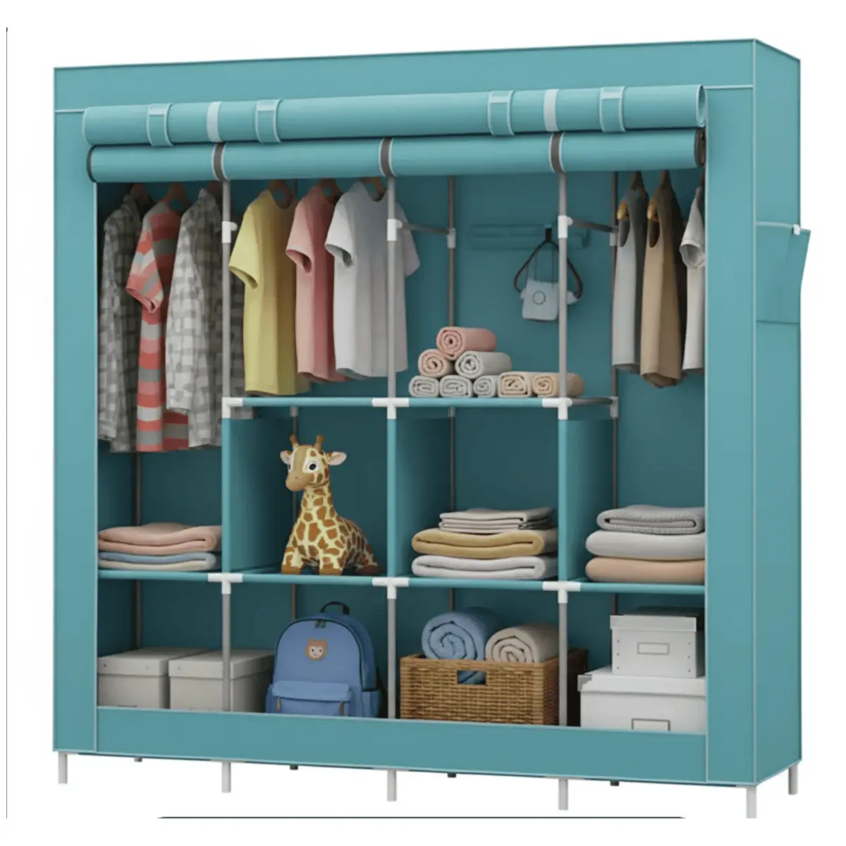 El Armario Portátil Plegable con Estantes y Perchero – Tela Resistente, Gran Capacidad y Diseño Antipolvo es la solución ideal para quienes buscan optimizar el espacio en su hogar. Con unas dimensiones de 1,72 m de altura, 1,68 m de ancho y 45 cm de profundidad, este organizador se adapta perfectamente a cualquier rincón, ofreciendo un amplio espacio para almacenar ropa y accesorios.
