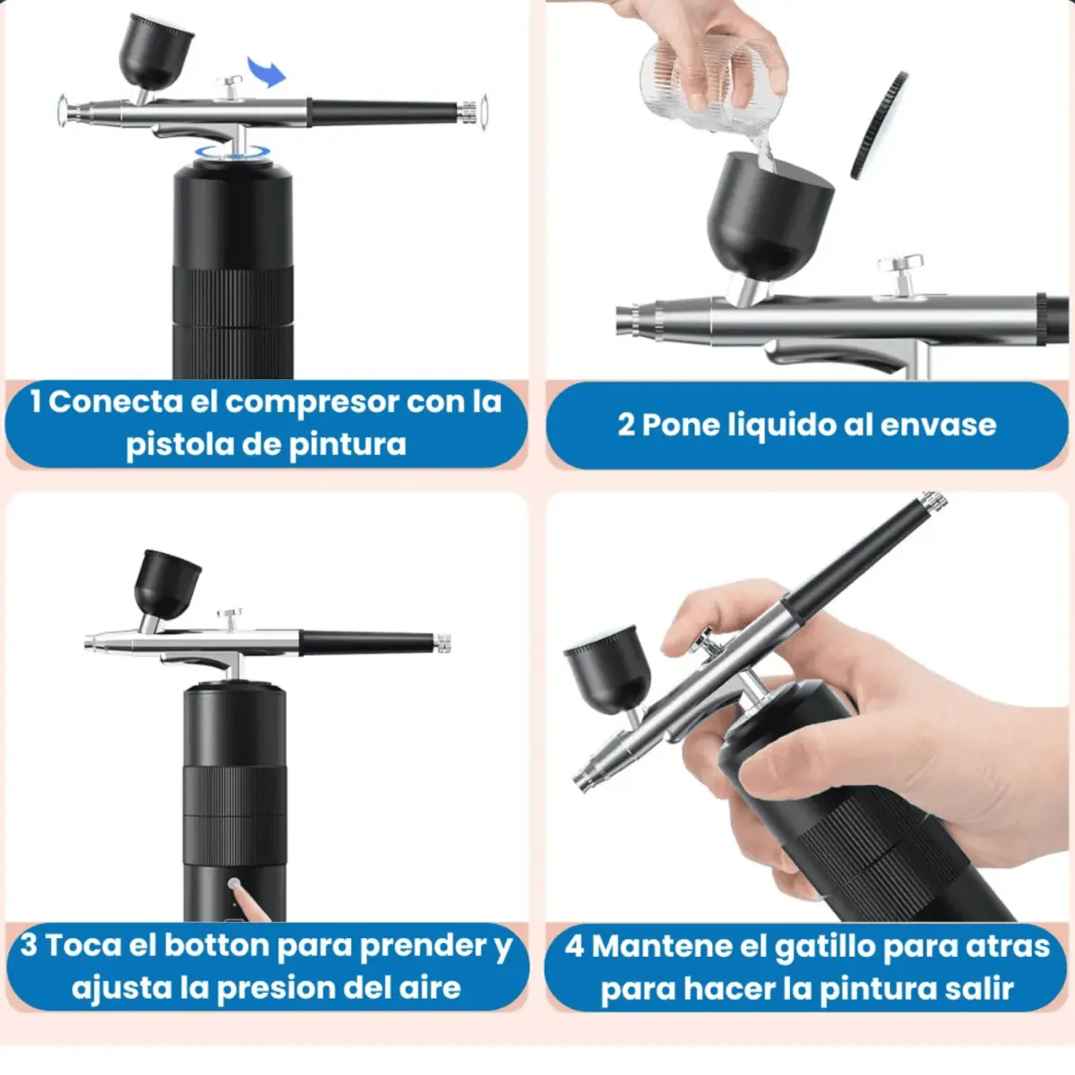 - Presión ajustable, permitiendo un control preciso del flujo de aire y pintura.