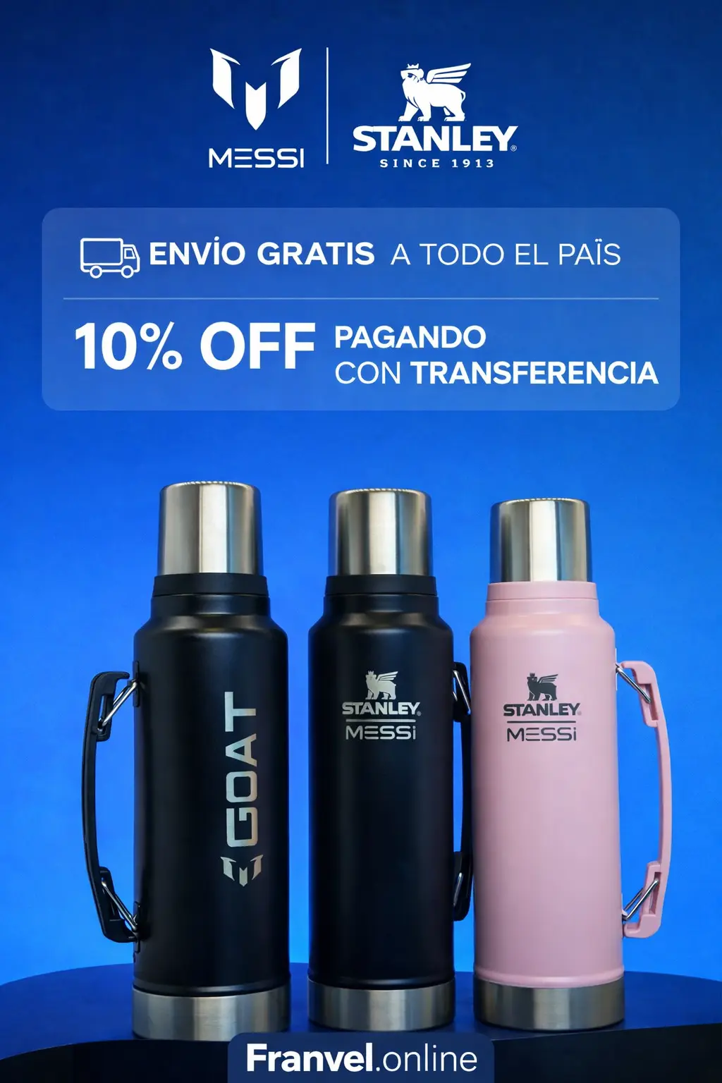 Con su robusta construcción de acero inoxidable y un elegante acabado en negro mate, este termo de 1.2 litros lleva grabado el icónico logo de Stanley y la palabra "MESSI", rindiendo homenaje a la grandeza. Mantiene tus bebidas calientes o frías hasta por 32 horas y el hielo por hasta 160 horas, ideal para cualquier aventura, jornada laboral o para acompañarte en cada partido. Su manija ergonómica asegura un transporte cómodo, haciendo de este termo un artículo de colección y uso diario.